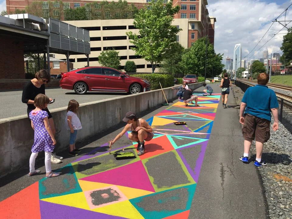 /Jessie and Katey, a Baltimore-based artist duo, have painted 3 awesome murals on the Rail Trail thanks to ArtPlace America grant funding. The 3 vibrant, colorful murals can be found in South End and Uptown. Each mural design is different and inspired by artwork created by the Rail Trail community. In March 2016, the artists paid a visit to Charlotte to host a series of hands-on community workshops and gather input for the final mural designs.